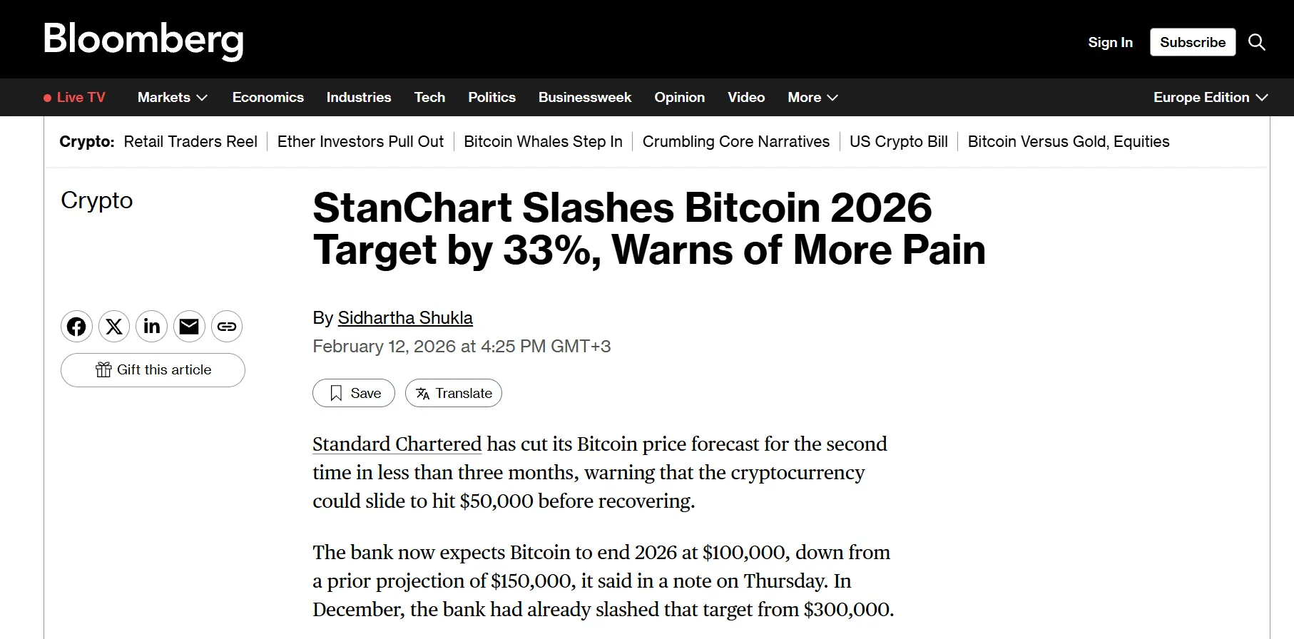 स्टैंडर्ड चार्टर्ड ने तीन महीनों में दूसरी बार 2026 के अंत के लिए बिटकॉइन की लक्ष्य कीमत घटाई है: