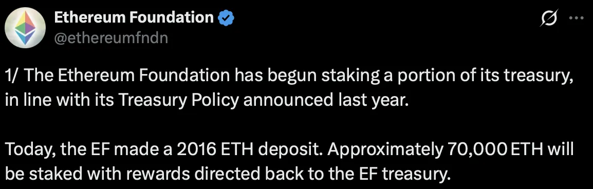 Ethereum Foundation telah mulai melakukan staking sebagian ETH-nya. Sebanyak 2.016 ETH telah di-stake. Secara keseluruhan, direncanakan akan di-stake sekitar 70.000 ETH – semua imbalan akan dikembalikan ke kas yayasan.