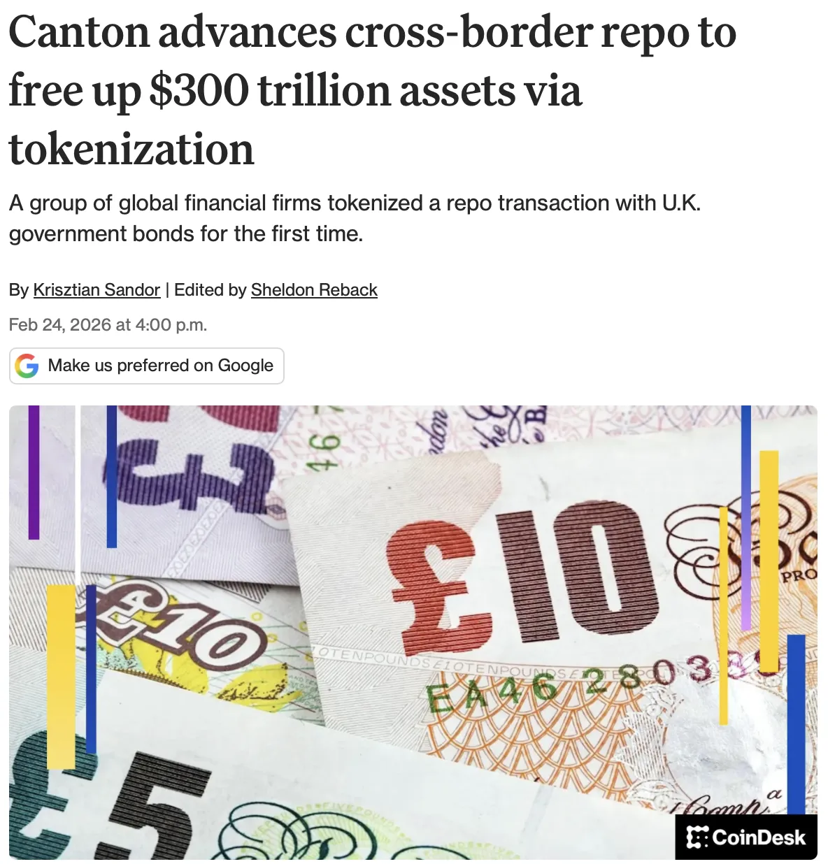 Perusahaan keuangan besar (DTCC, LSEG, Euroclear, Tradeweb, Citadel Securities, dan Societe Generale) untuk pertama kalinya melakukan transaksi repo lintas batas intraday dengan gilt yang ditokenisasi di blockchain Canton Network. Transaksi ini juga menjadi yang pertama di mana gilt ditukar dengan deposito dalam mata uang selain pound sterling.