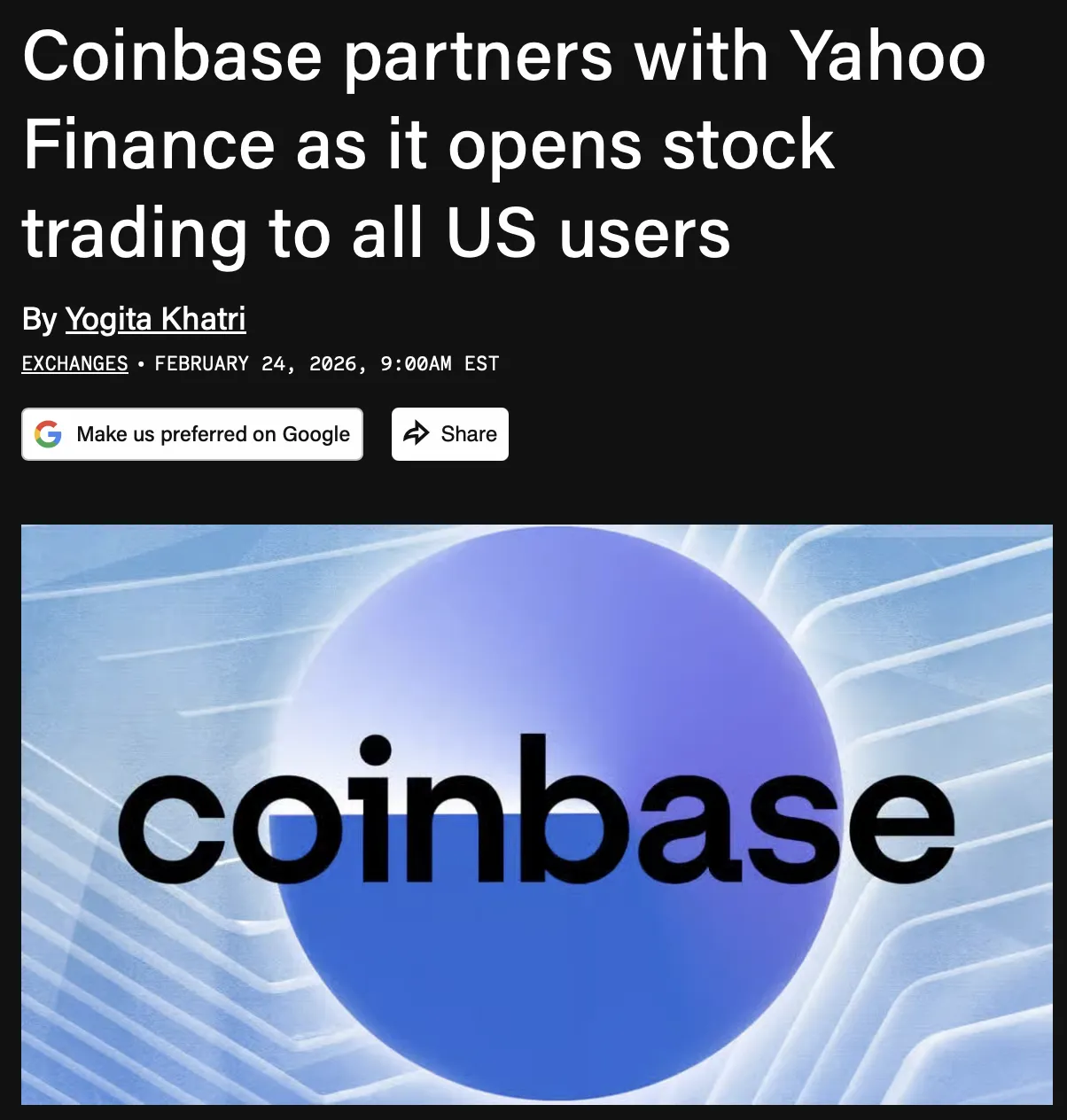 Secara paralel, bursa ini telah mencapai kesepakatan dengan Yahoo Finance: tombol untuk langsung beralih ke perdagangan di Coinbase akan muncul di halaman aset platform. Pengguna baru akan mendapatkan langganan Coinbase One gratis selama sebulan tanpa komisi.