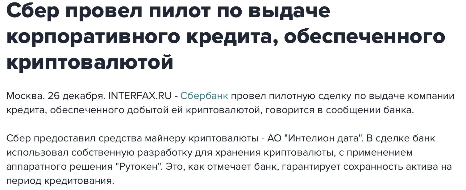 Sberbank carried out a pilot operation to issue a corporate loan secured by cryptocurrency. The borrower was the mining company Intelion Data JSC.