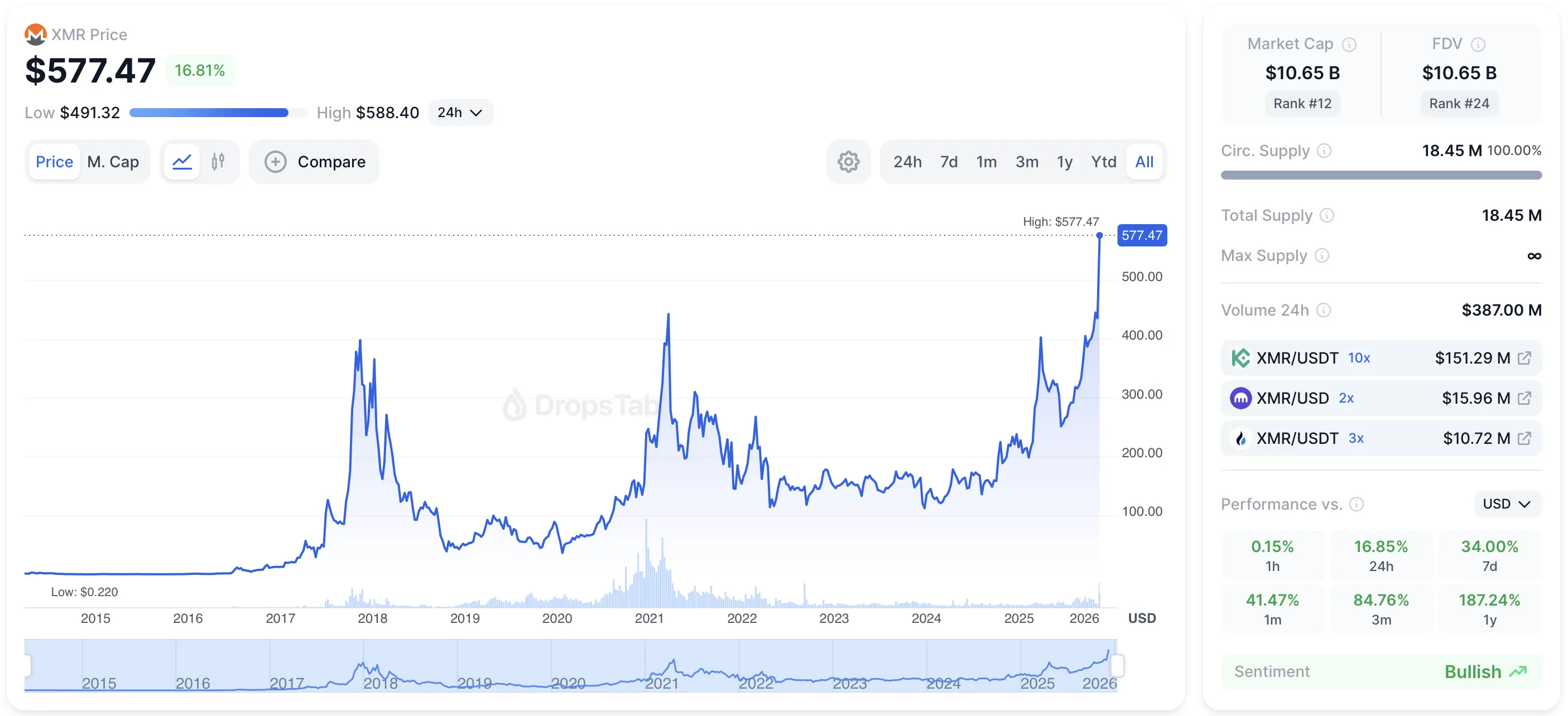Monero (XMR) reached a new all-time high of ~$577 following news that the Zcash team had left Electric Coin Company to form an independent entity.