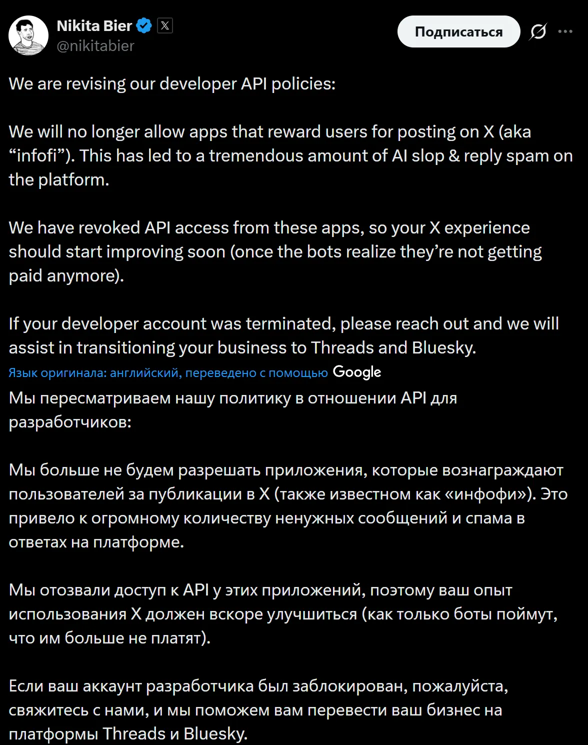 We are revising our API rules: we no longer allow apps that reward users for posting on X (so-called "infofi"). This has led to a huge amount of AI garbage and spam in responses. We have revoked these apps' API access, so your X experience should improve soon—once bots realize they are no longer being paid. If your developer account has been deleted, please contact us and we will help you transition your business to Threads and Bluesky.
