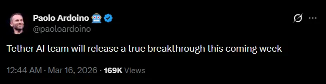 NewsTether has announced a "groundbreaking" AI product for next weekTether has announced a "groundbreaking" AI product for next week16 Mar, 2026byDropsCapitalJoin Our SocialsShare Continue reading this article on source: x.com