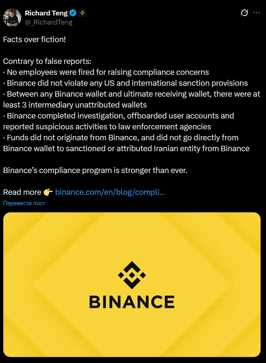 According to Binance, the situation is different: the funds did not originate or end on the exchange but passed through numerous intermediary wallets. The company claims that only about $126 million of the amount in question ultimately reached wallets with Iranian ties, of which $24.1 million went to wallets linked to the IRGC. The exchange states that it identified the suspicious activity itself during its investigation, froze the involved accounts, and shared the information with law enforcement.