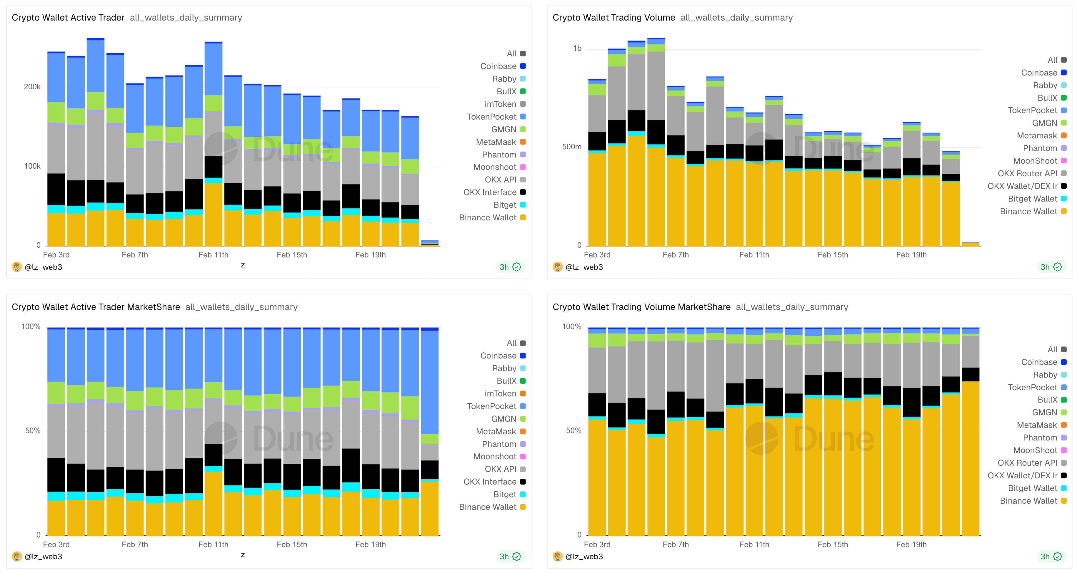 W ostatnim miesiącu zarówno liczba aktywnych użytkowników, jak i wolumen obrotu przez Binance Wallet gwałtownie wzrosły. Aby zobrazować sytuację, Binance Wallet nie tylko konkuruje z gigantami branży jak MetaMask — całkowicie je dominuje.