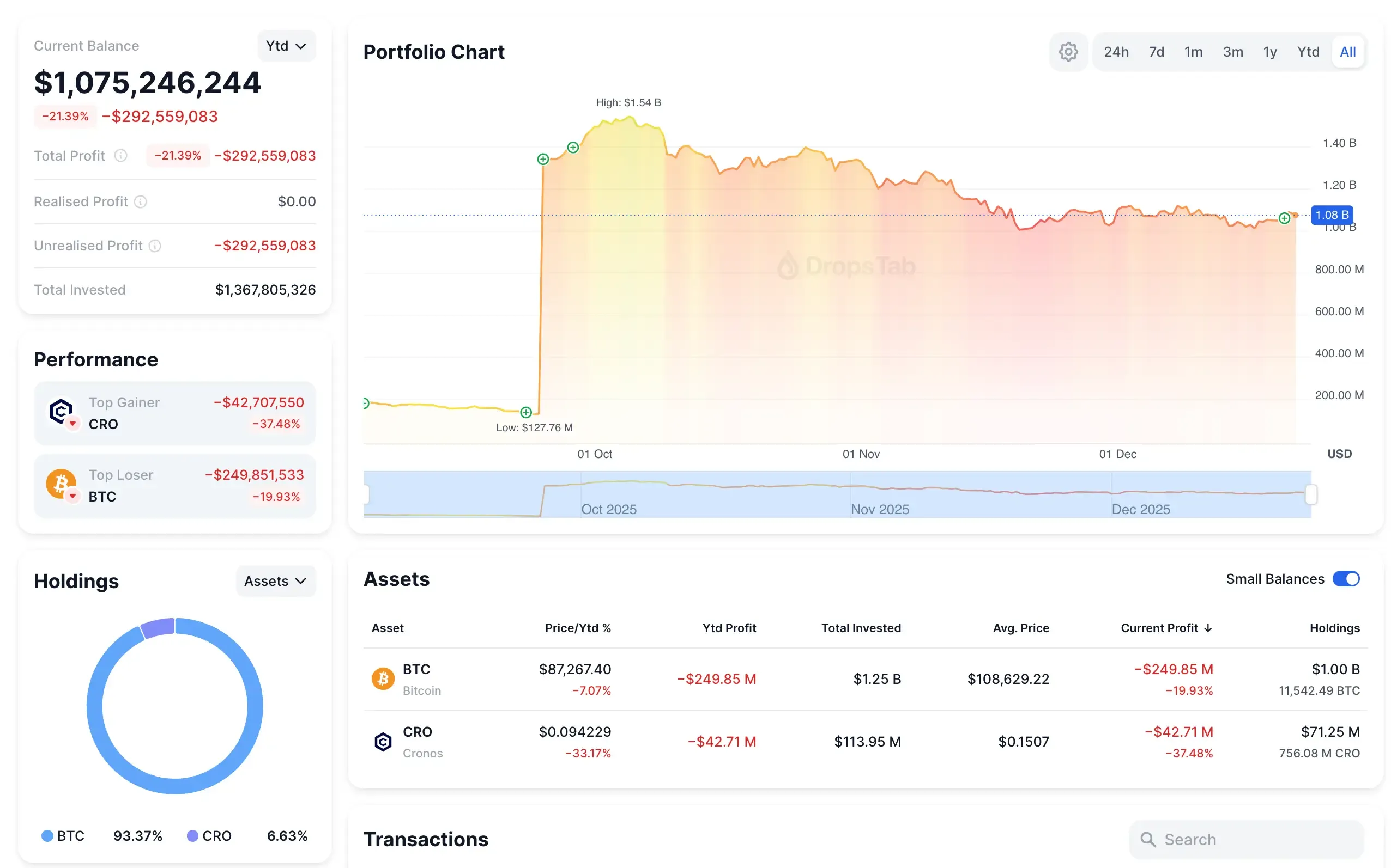 TMTG’s Bitcoin position can be verified directly on-chain. Portfolio aggregation tools like DropsTab consolidate wallet activity into a single timeline, showing both accumulation points and drawdowns. As of late December 2025, the chart reflects roughly 11,542 BTC worth about $1.08B, down ~21% YTD, with Bitcoin making up over 93% of total holdings. The step-change in Q4 confirms active accumulation—and the absence of sell events confirms continued conviction.