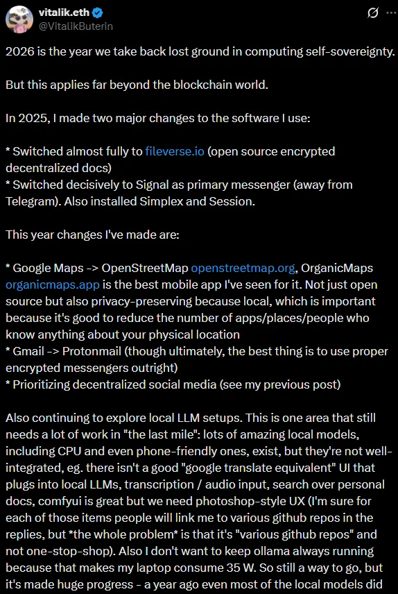 Бутерин заявил, что 2026 год должен стать ключевым для восстановления пользовательского контроля над данными и вычислениями. Он отметил, что за последнее время сознательно перешёл на более приватные и децентрализованные инструменты - от карт и почты до мессенджеров и социальных платформ, сократив зависимость от централизованных сервисов.