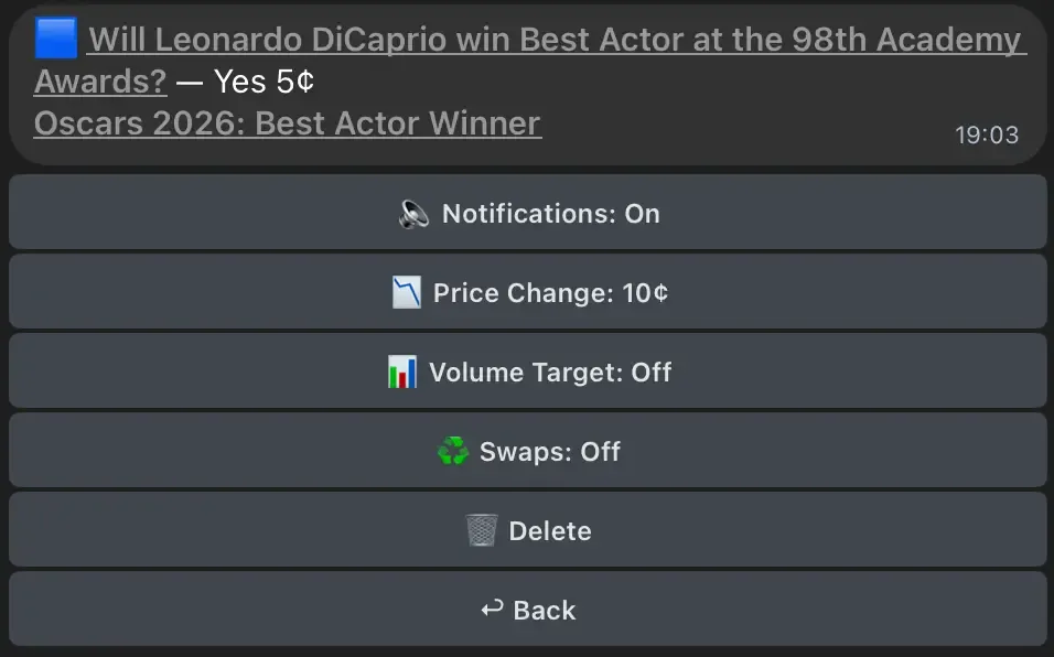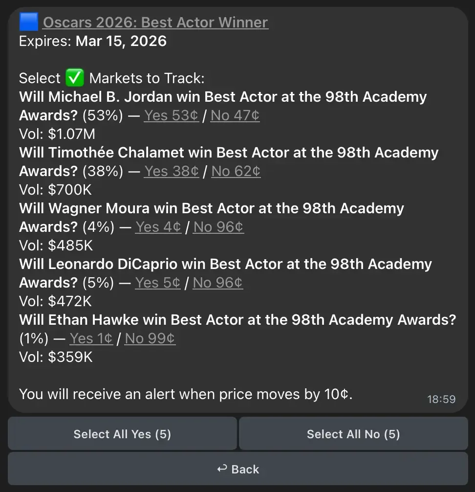 - Чтобы отслеживать сложный спред (например, "Oscars 2026 Best Actor"), вставьте общую ссылку на событие. Бот создаст интерактивную встроенную клавиатуру для выбора ваших точных переменных.