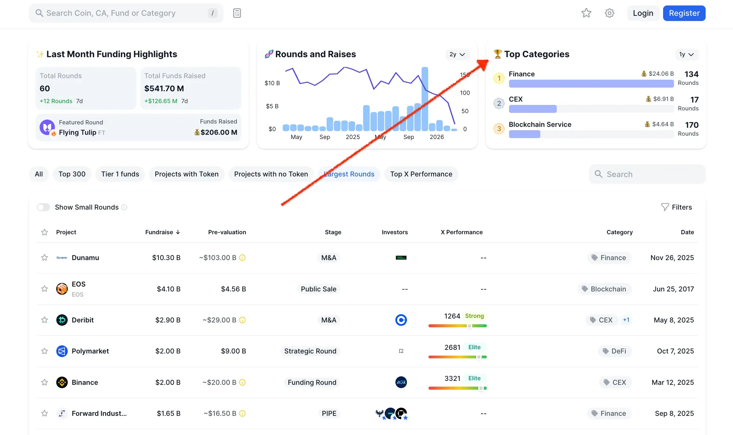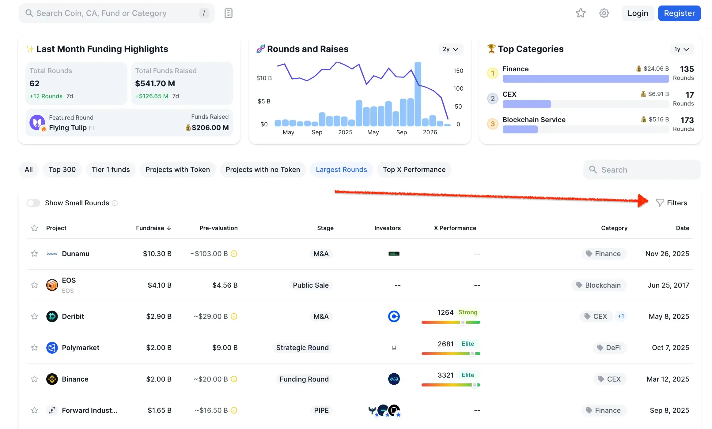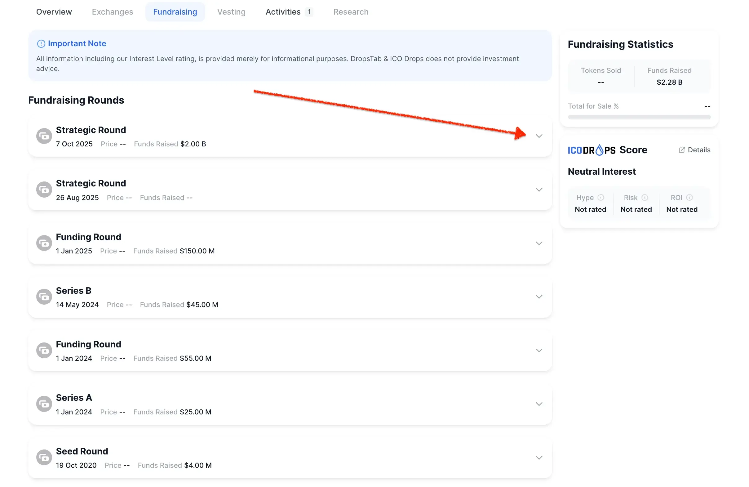 - การเจาะลึกเฉพาะสินทรัพย์: แพลตฟอร์มนี้มีแท็บการระดมทุนเฉพาะสำหรับเหรียญแต่ละเหรียญ ช่วยให้คุณดูประวัติการเงินทั้งหมดของโครงการตั้งแต่ Seed ถึง Series C