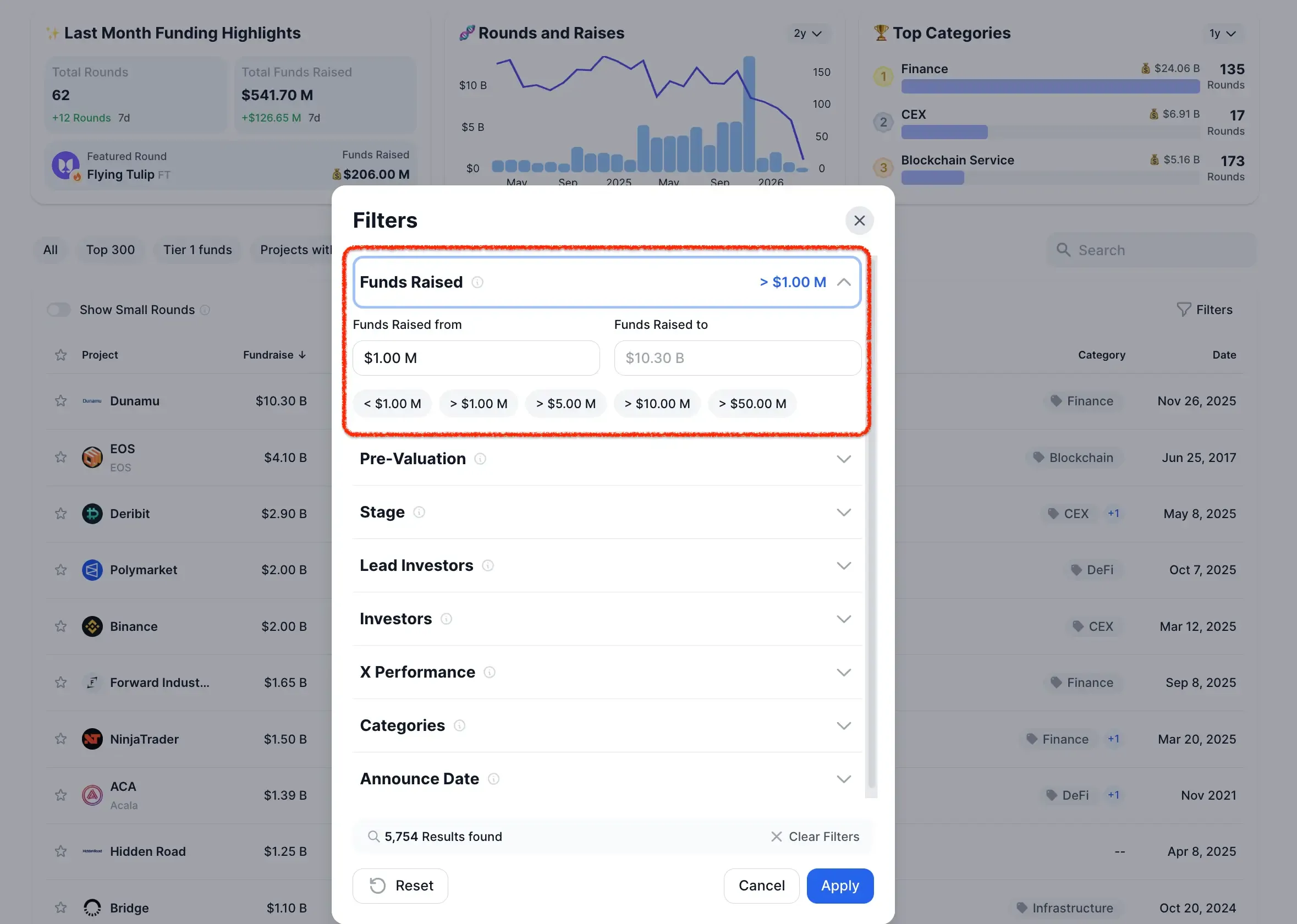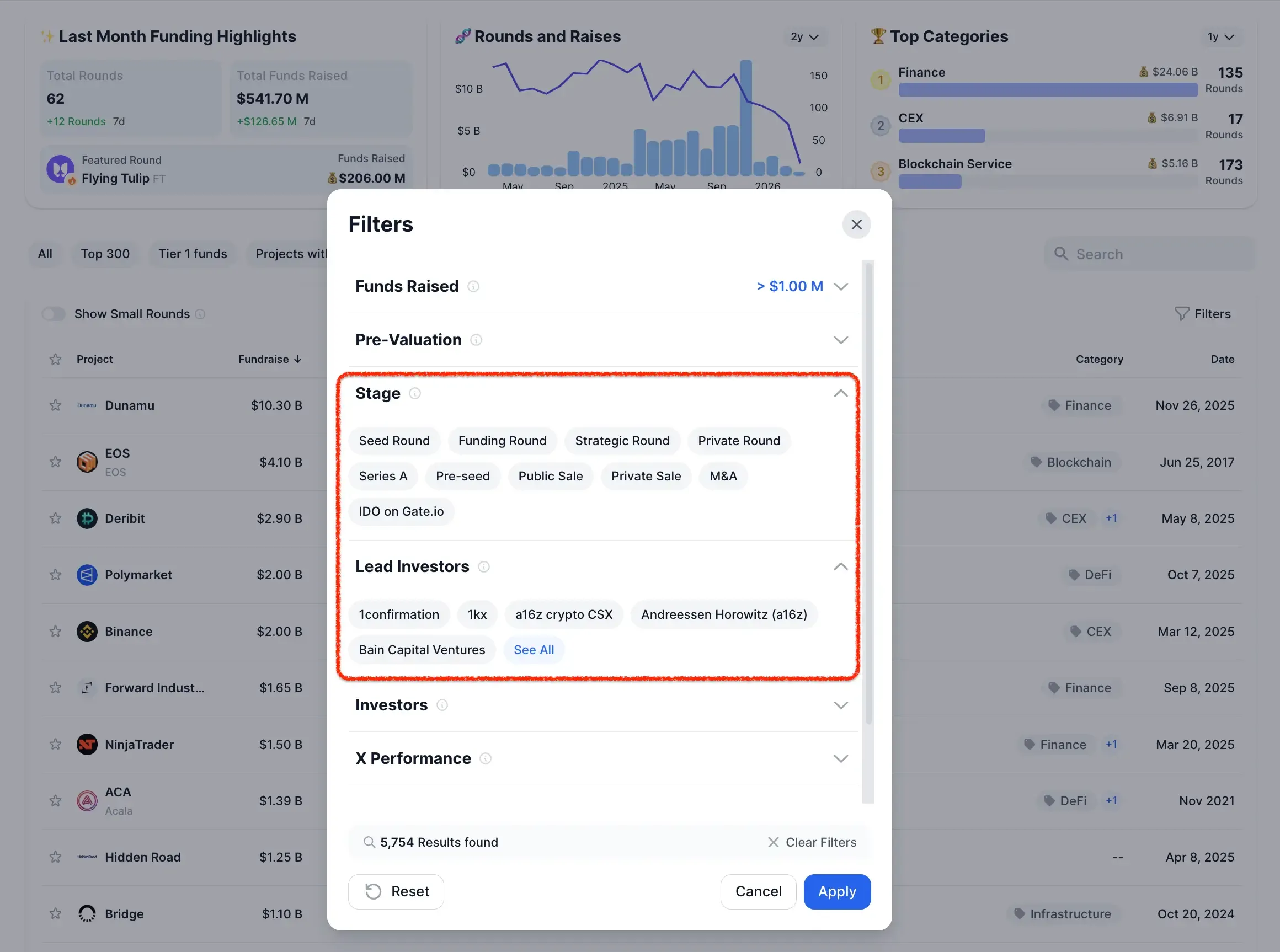 จากที่นั่น คุณสามารถปรับแต่ง "Stage" และ "Lead Investors" การใช้เมตริกที่แม่นยำเหล่านี้ทำให้มั่นใจได้ว่าคุณใช้เวลาเฉพาะในการดูโครงการที่ตรงตามเกณฑ์การลงทุนที่เข้มงวดและเป็นส่วนตัวของคุณเท่านั้น