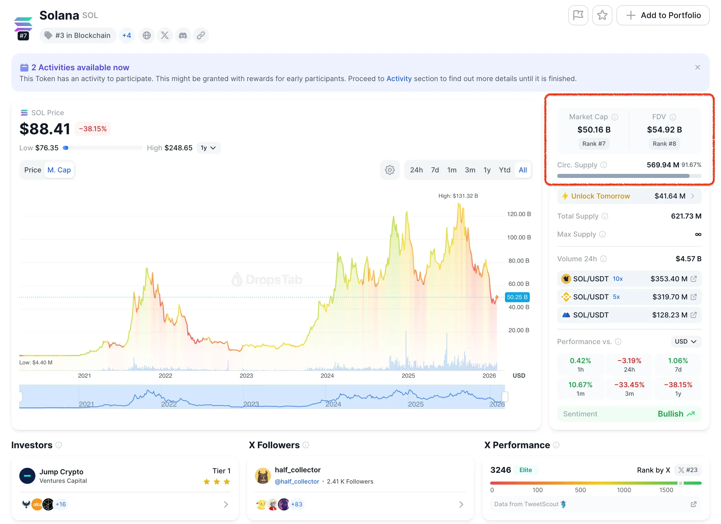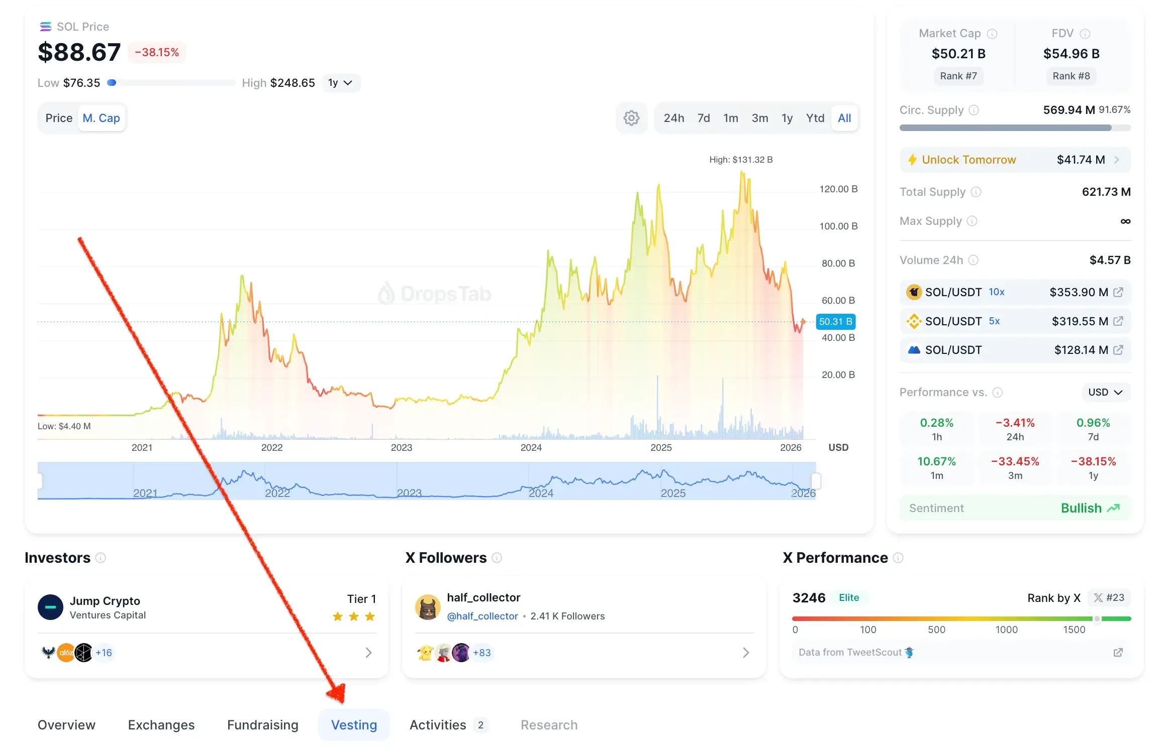 DropsTab ให้ข้อมูลอินโฟกราฟิกที่ละเอียดมากในหน้าของเหรียญแต่ละเหรียญ โดยใช้ Solana เป็นตัวอย่าง มาดูวิธีการนำทางไปยังแท็บเฉพาะของสินทรัพย์Fundraising".