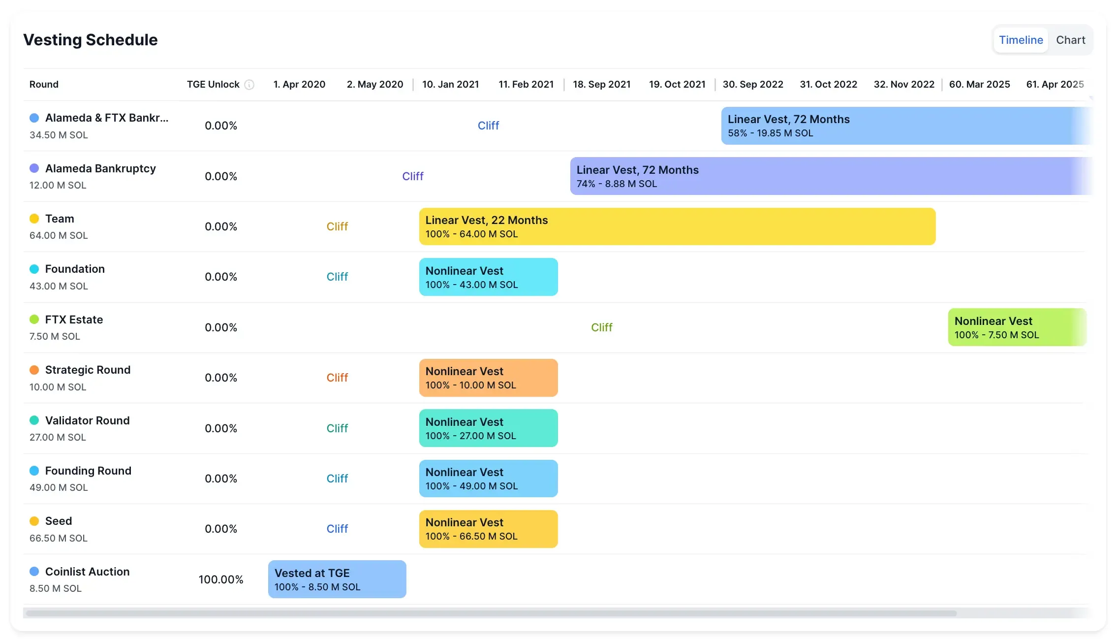 ตามที่เห็นในอินโฟกราฟิกตัวอย่างนี้ รายการนี้แสดงทุกเหตุการณ์ตั้งแต่ "Seed" รอบแรกไปจนถึง "Private Sales" หรือ "Strategic Rounds" มันให้คุณเห็นภาพรวมของเส้นทางการเงินของโครงการ แสดงวันที่ ราคาต่อโทเค็นในรอบนั้น ทุนทั้งหมดที่ระดมได้ และ ROI ปัจจุบันใน USD