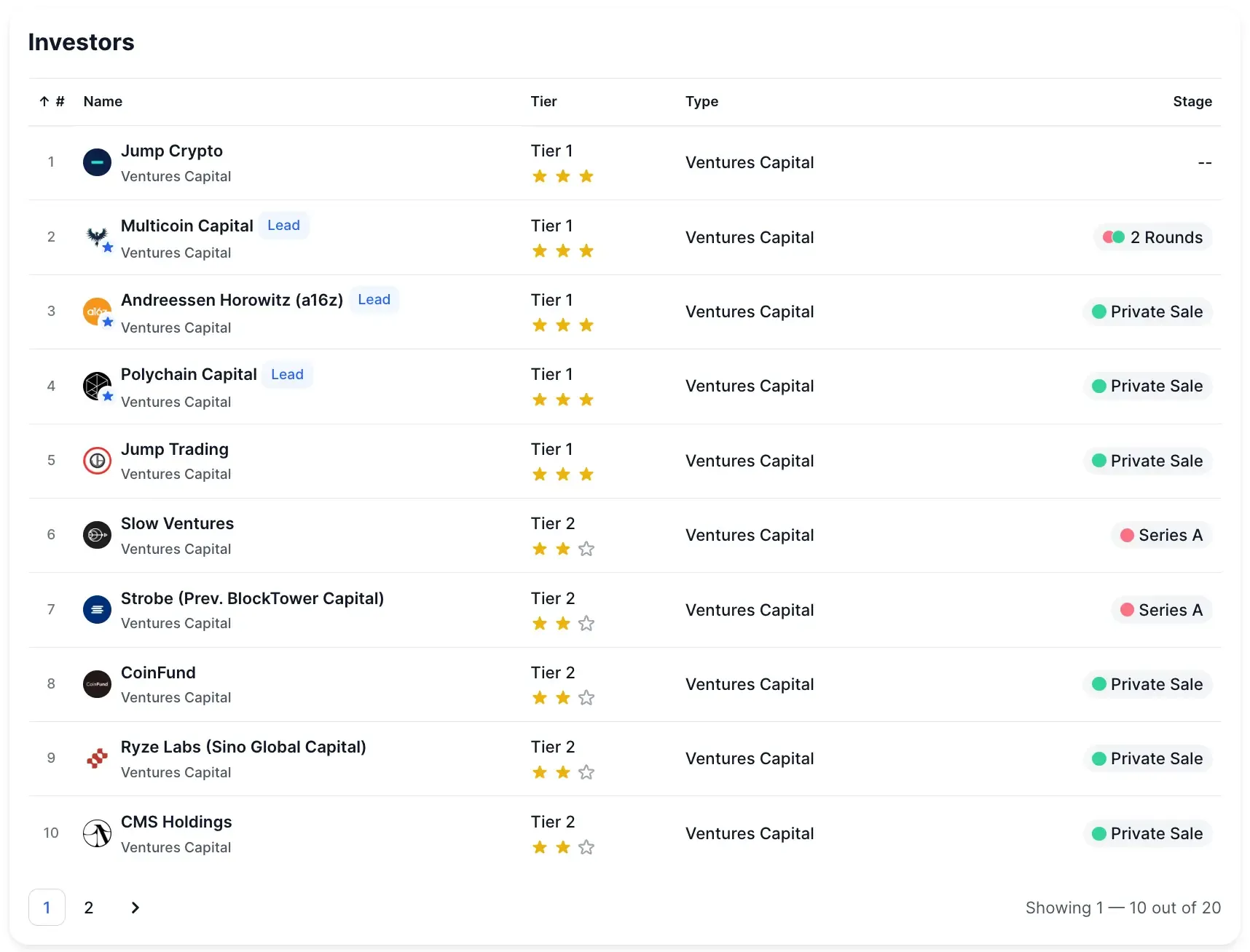 แทนที่จะให้รายชื่อสุ่มๆ แพลตฟอร์มนี้จัดหมวดหมู่ทุกหน่วยงานที่สนับสนุนโครงการ คุณสามารถเห็นได้ทันทีว่าสินทรัพย์นั้นถูกครอบงำโดยทุนร่วม "Tier 1" หรือไม่ เช่น Jump Crypto, Multicoin Capital, หรือ a16z ในตัวอย่าง Solana นี้ หรือถ้าเป็นกองทุนที่ไม่รู้จักส่วนใหญ่ มันจะแยกแยะขั้นตอนที่พวกเขาเข้ามาและประเภทของนักลงทุนที่พวกเขาเป็น มันเป็นวิธีที่รวดเร็วในการดูว่า "เงินฉลาด" มีความมั่นใจสูงและยั่งยืนที่นี่หรือไม่