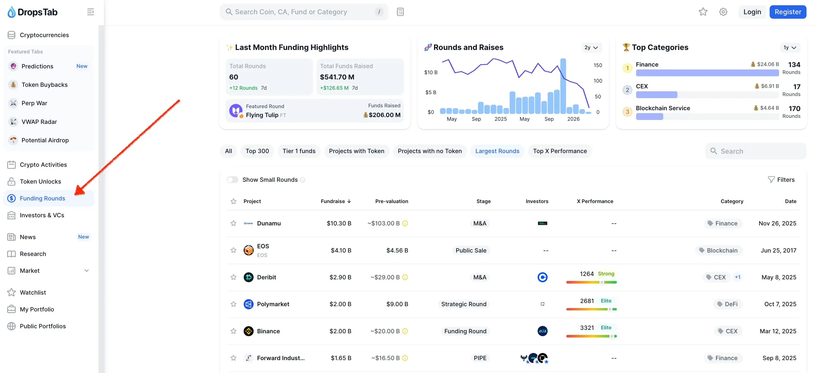 ก่อนอื่นไปที่หน้าDropsTab Funding Rounds .